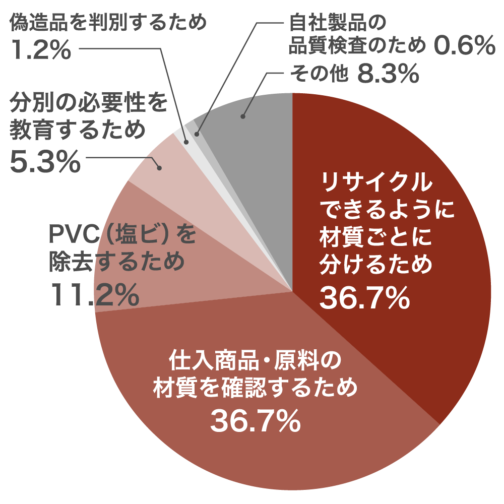 プラスチック(樹脂)原料を受け入れる際の材質判別や、自社で製造している製品の材質判別を容易にすることで、業務の効率化に貢献しています。