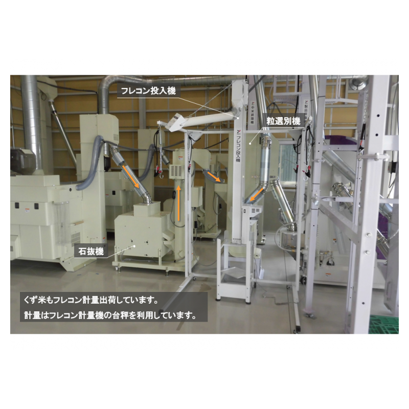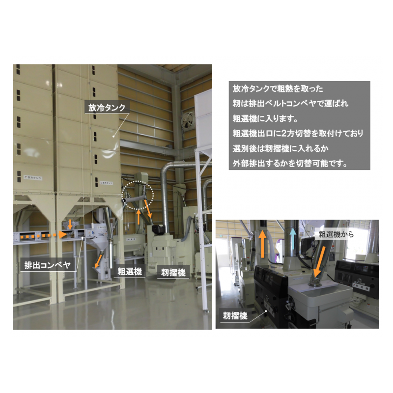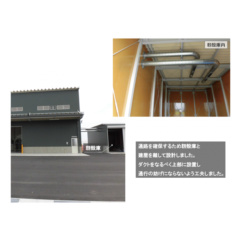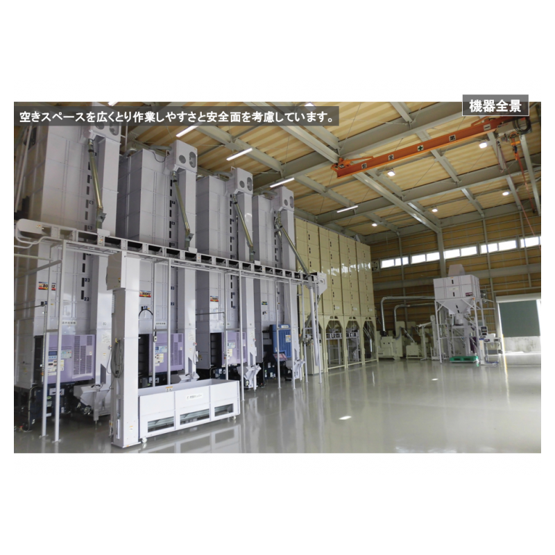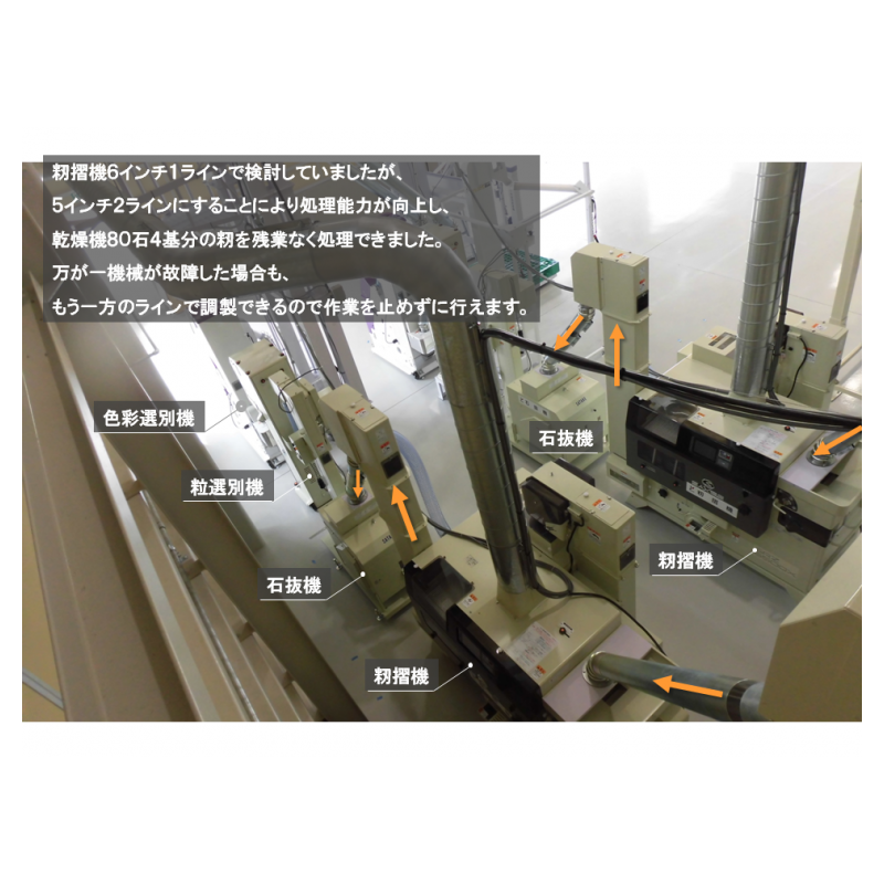 前面の空きスペースを広くして、作業をしやすく、安全面も考慮しました。乾燥後の調製設備を籾摺機5インチ2ラインにすることで万が一機械の故障があった場合にも、残りの1ラインで作業を止めることなく処理することができます。