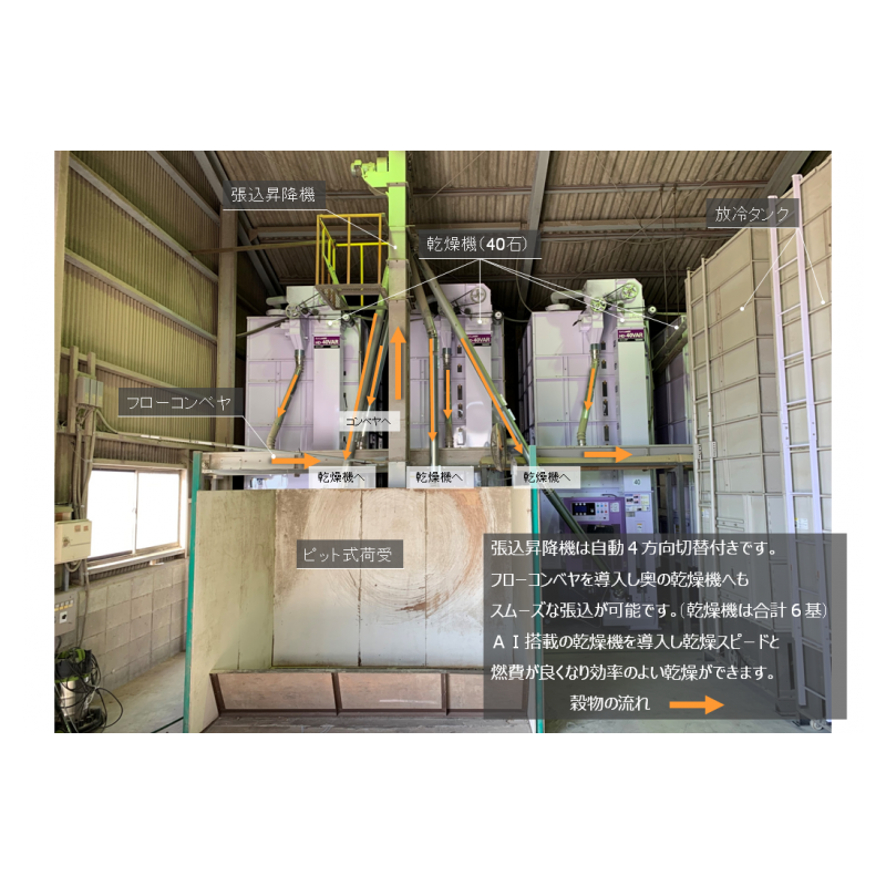 AI搭載の乾燥機3基を導入し燃費向上と乾燥時間短縮ができました。張込昇降機は自動4方向切替付きでスムーズな張込を実現しています。