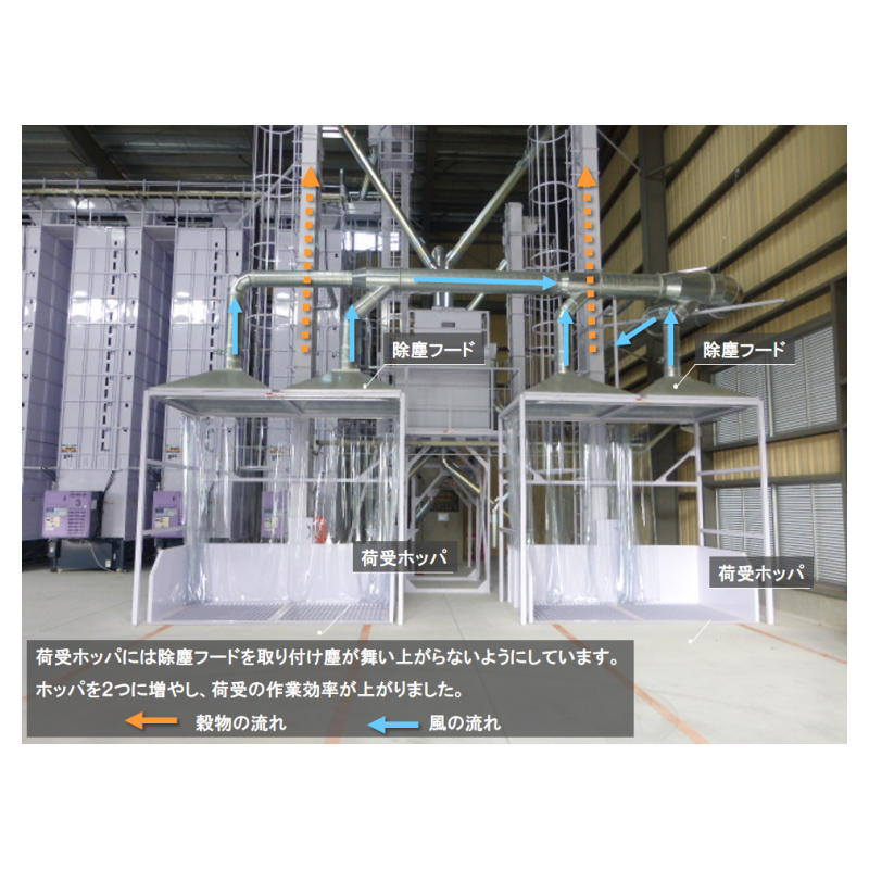 荷受けホッパの除塵フードや集塵機の設置などの改善にこだわりオペレーターさんの作業環境をクリーンにしています。