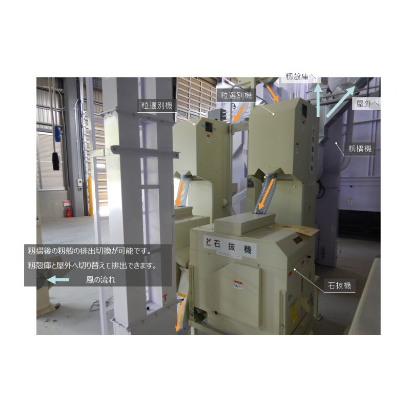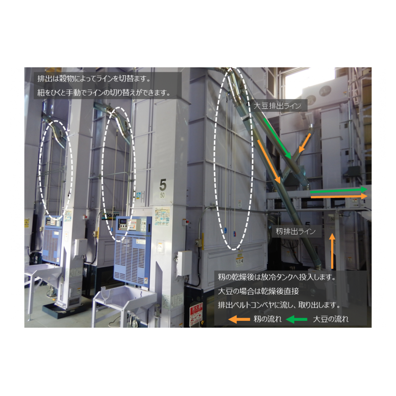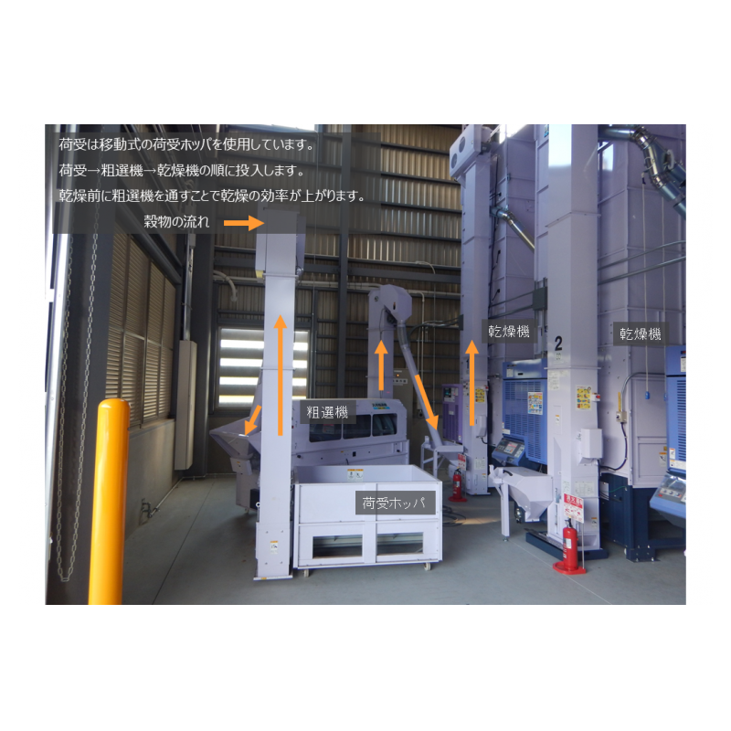 籾から大豆まで幅広く受け入れできる施設です。掃除のしやすさや穀物切替のしやすさにこだわりました。穀物の種類によって切替を付けて、いろいろなルートに流すように工夫しています。