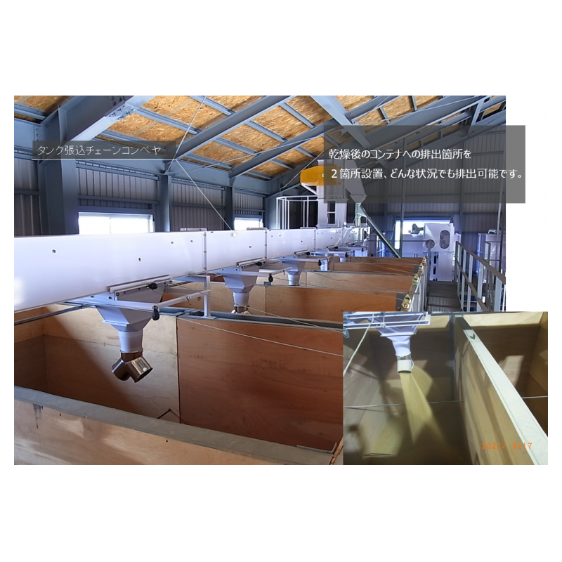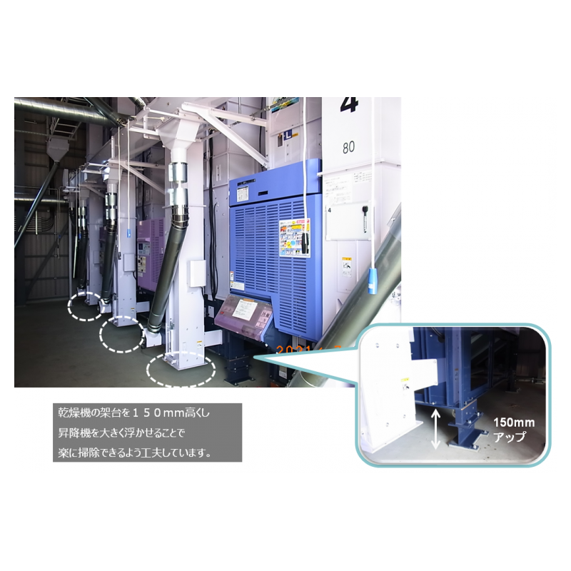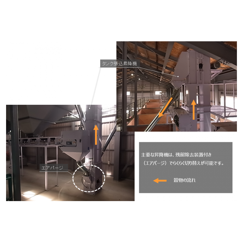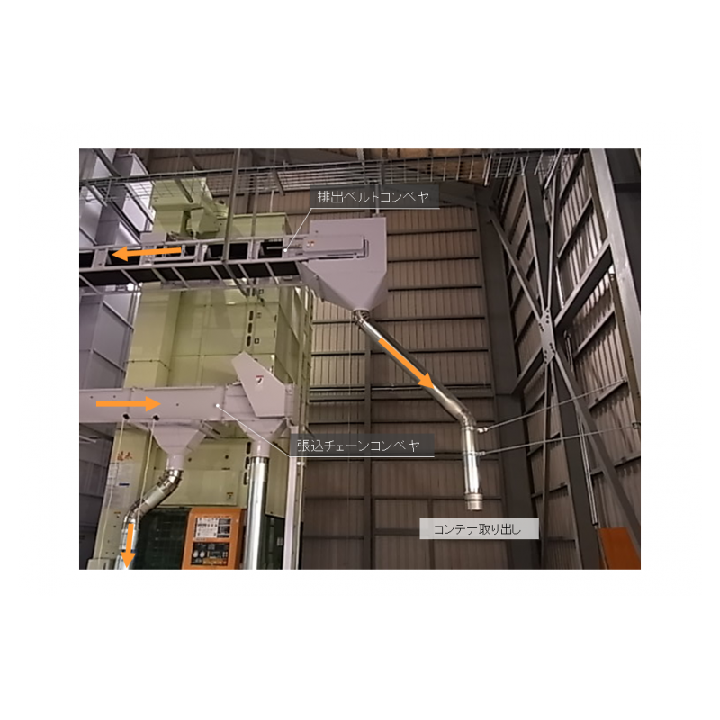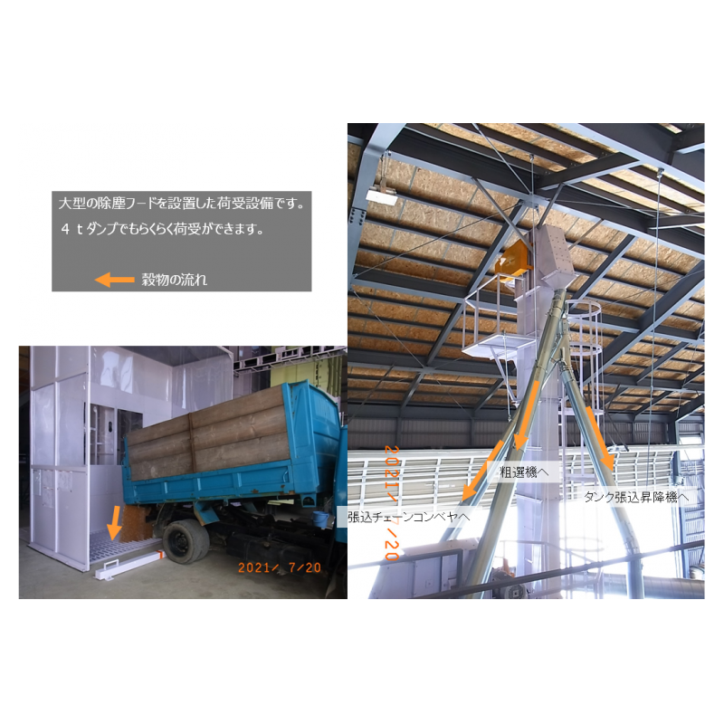 大型の荷受フードで、4tダンプでもらくらく荷受行えます。主要な昇降機は、残留除去装置付き(エアパージ)で切替が簡単です。乾燥機の架台も高さアップで掃除がしやすい様工夫しました。