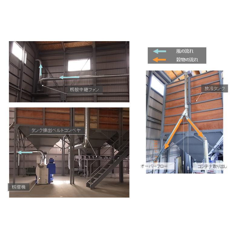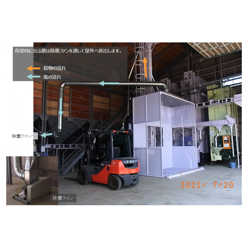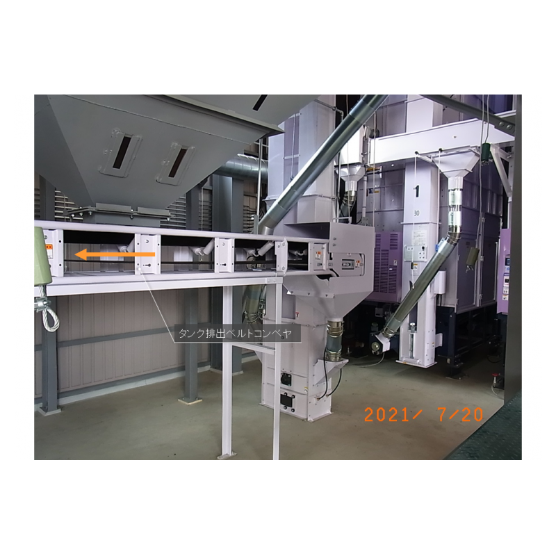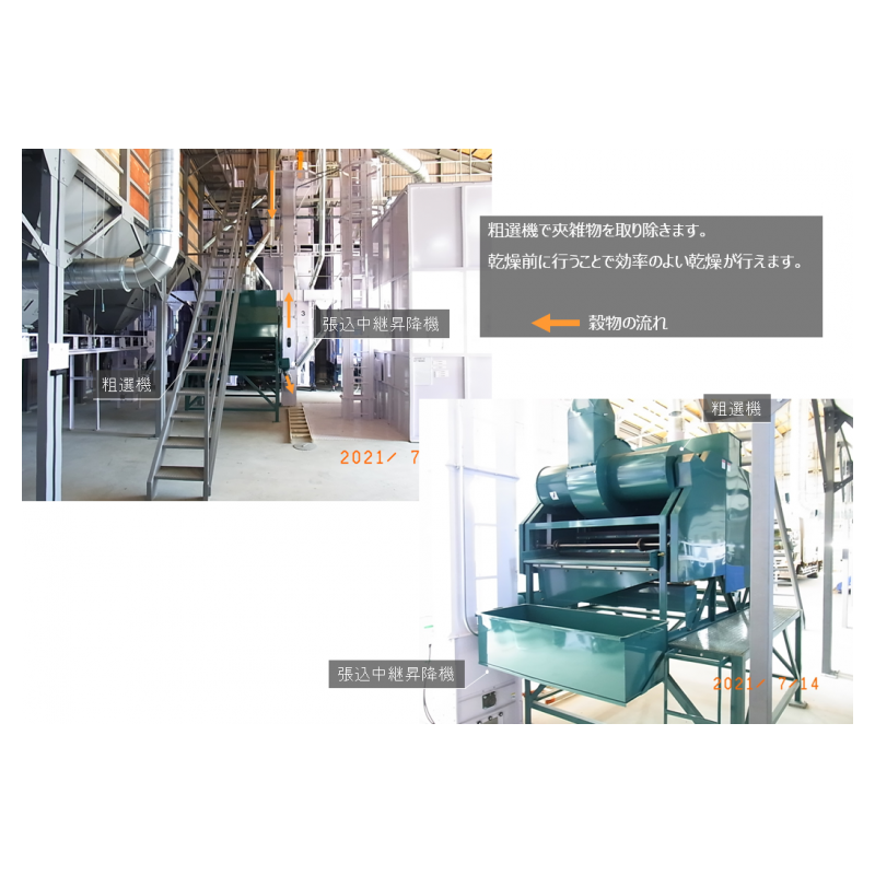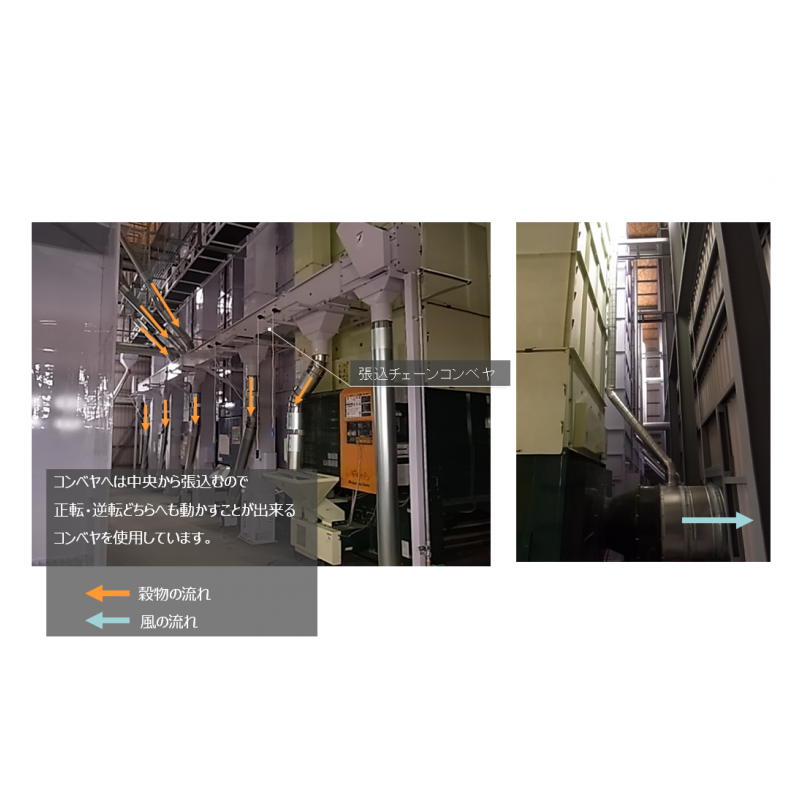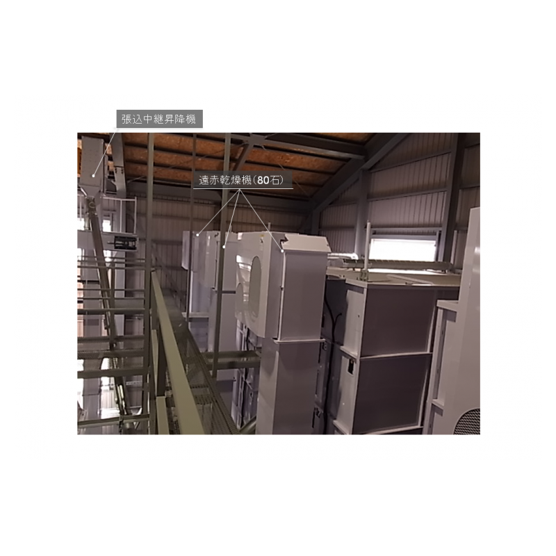 大型の荷受フードで、4tダンプでもらくらく荷受行えます。主要な昇降機は、残留除去装置付き(エアパージ)で切替が簡単です。乾燥機の架台も高さアップで掃除がしやすい様工夫しました。