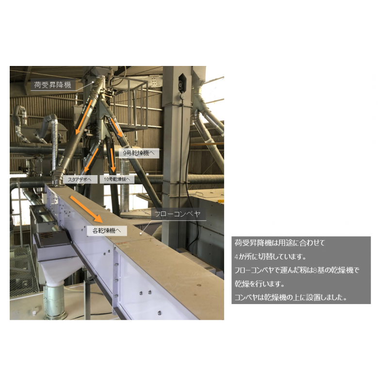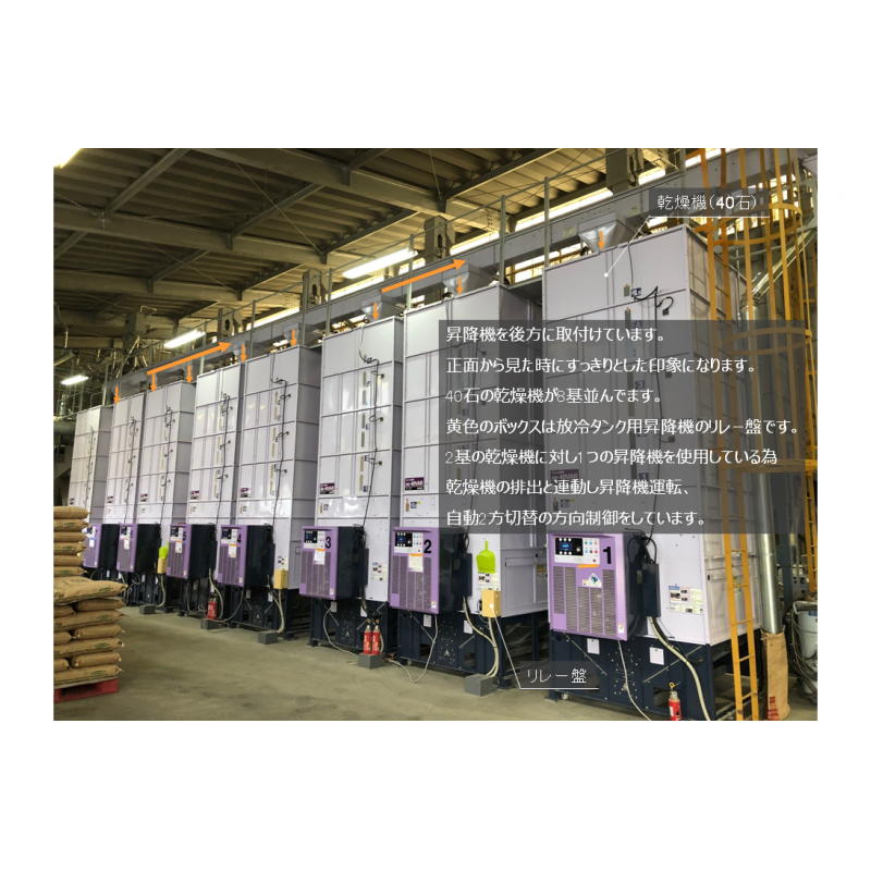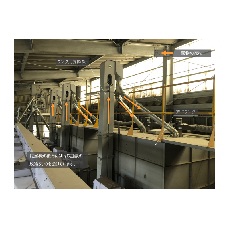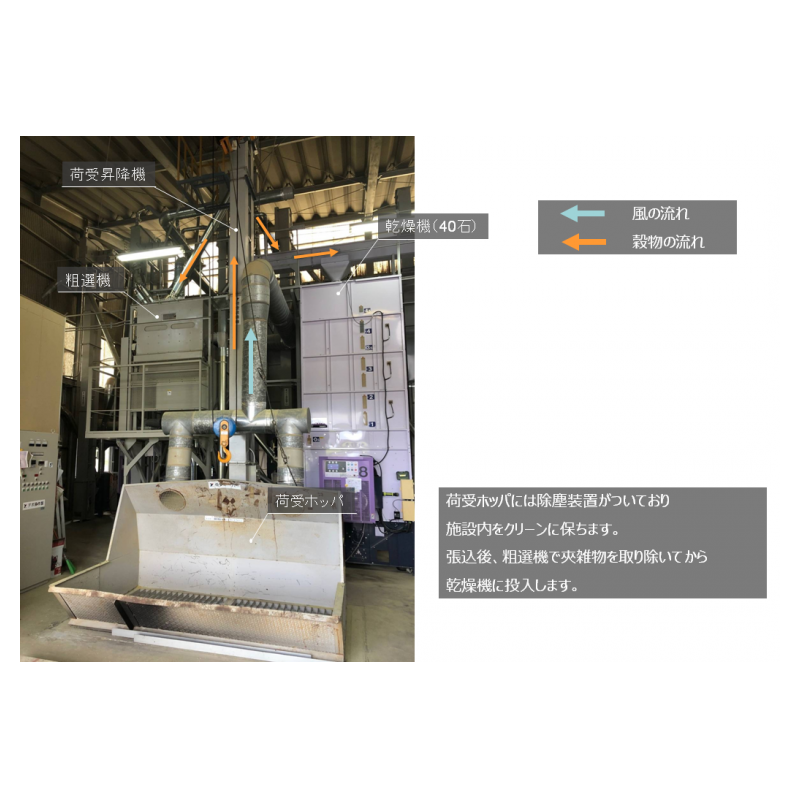 「スタアデポ」という乾燥も貯留もできる100tビン2基を導入しています。屋外にそのまま設置可能で、新たに建屋を建築する必要がありません。屋内の乾燥機の他にスタアデポを設置しているので容量も作業スケジュールも余裕ある乾燥作業が可能です。